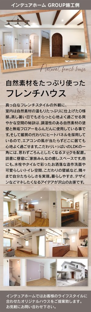 ヴィンテージスタイル、カリフォルニアスタイル、フレンチスタイル、プロヴァンススタイル、アメリカンスタイル、モダンスタイルの家のことなら、私たちインデュアホーム東長崎が、こだわりの住宅を自信をもって心を込めておつくりします。自然素材の塗壁や、無垢のフロアーなどをふんだんに使用して、高性能でエコな住まいづくりを心がけています。新築(注文住宅)・リノベーションのお問い合わせは、お気軽にインデュアホーム東長崎までご相談下さい。